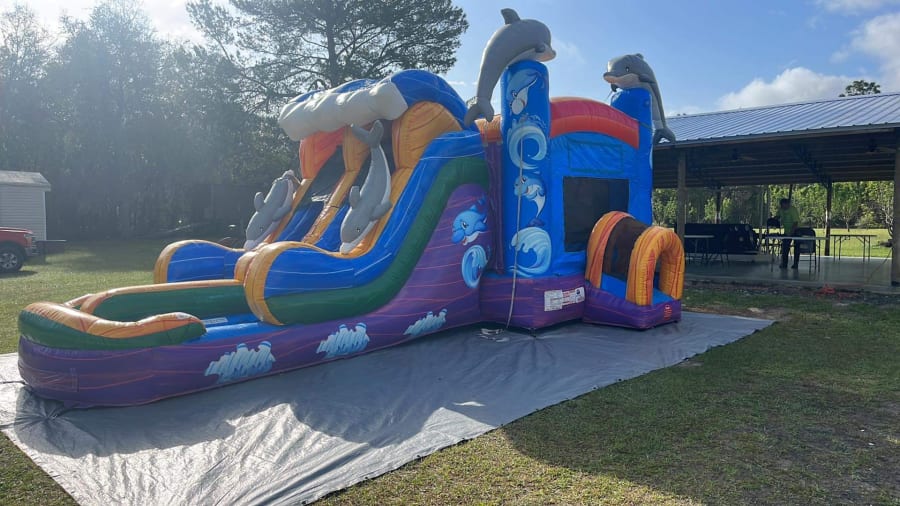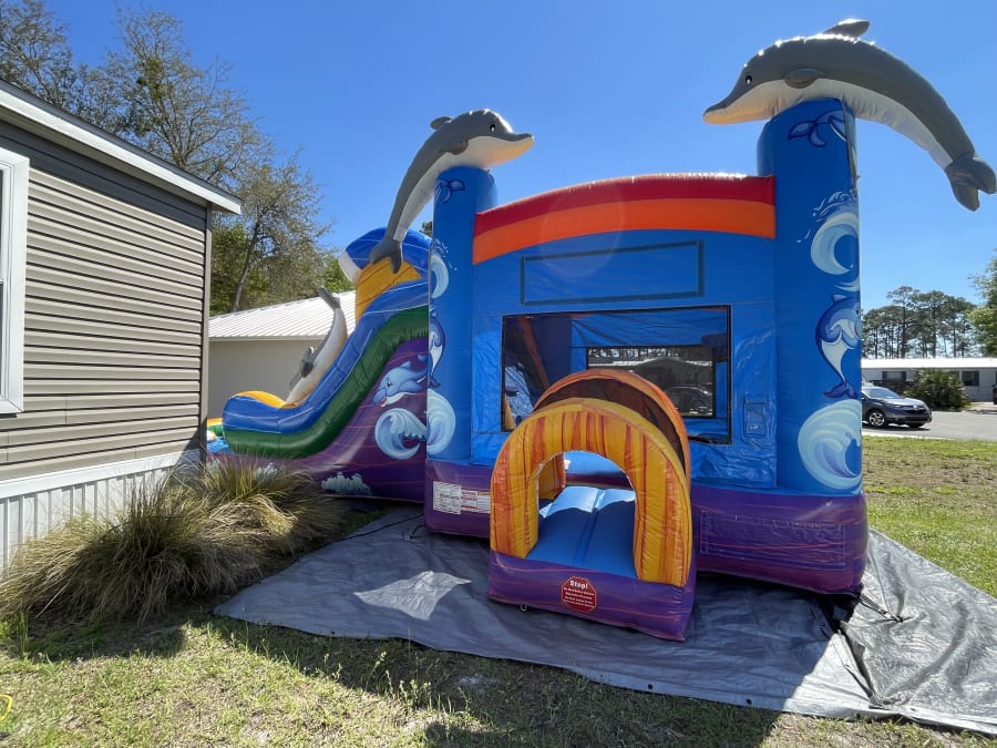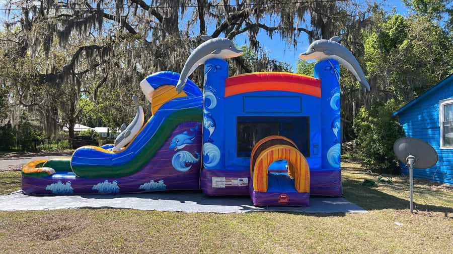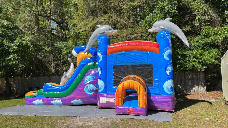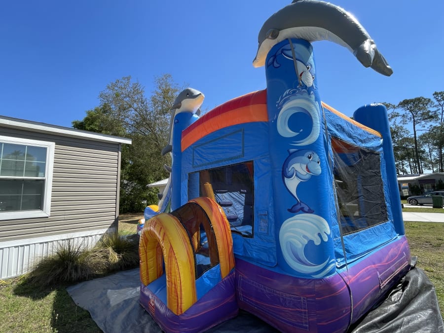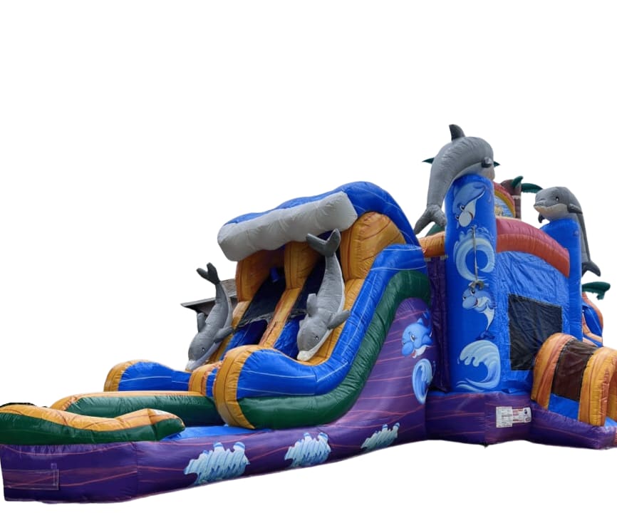 The Dolphin Dual Lane Combo is an awesome combo that has a jump zone and two awesome slides! This rental books fast, so reserve this rental for your event NOW to have the best party ever! L 13′ x W 30′ x H 13′