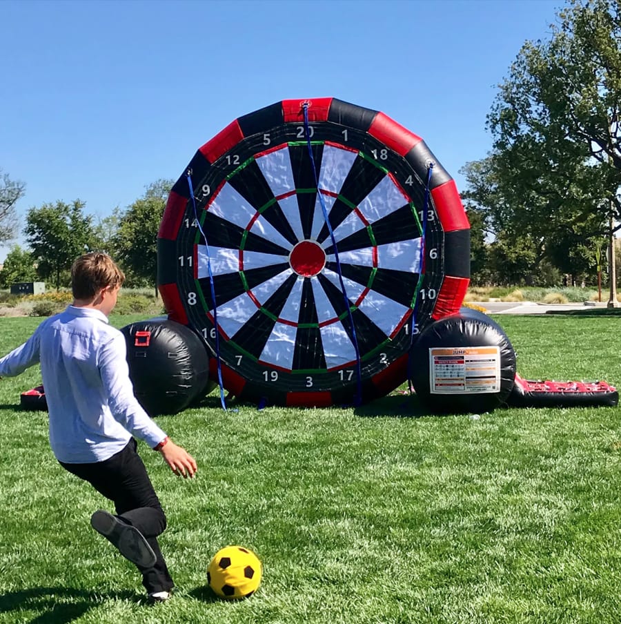 The innovative 10 ft. Soccer Dart with Side Game is always on the mark! If Soccer Dart isn't fun enough, you can add on the additional attachments for only an additional $25 each ! Baseball Banner and Fold-able Side Games (Tic Tac Toe & Drinking Game) with LED Light Pocket into ONE inflatable fun time. The side game can also be folded when space is limited. Add an interchangeable sports banner game as an optional purchase. This game is a great addition for corporate events, fundraisers, or backyard events.
