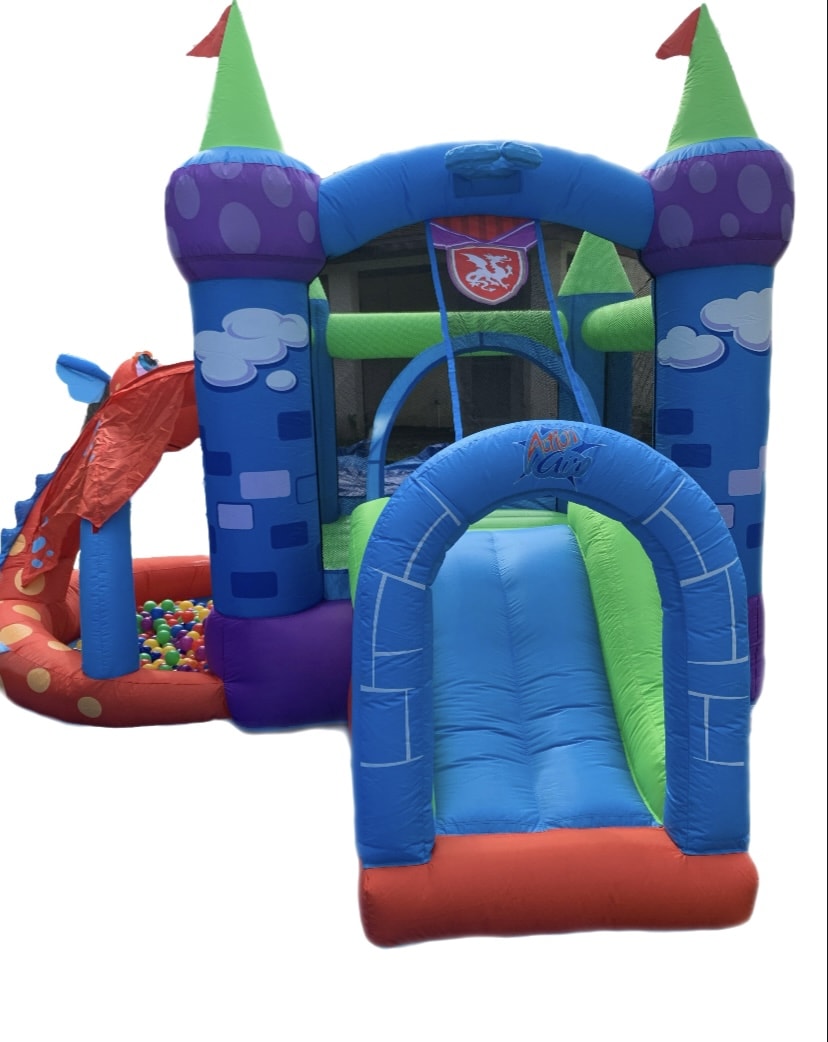 This combo is a magical castle with a slide for ages 4 & under! It also has a ball pit, dragon for shade, and a ball hoop and return over the slide! The Dragon Bouncer Combo is perfect for both indoor and outdoor events! Hurry and book this fun combo for your party before it is gone! 9'Wx 7'H