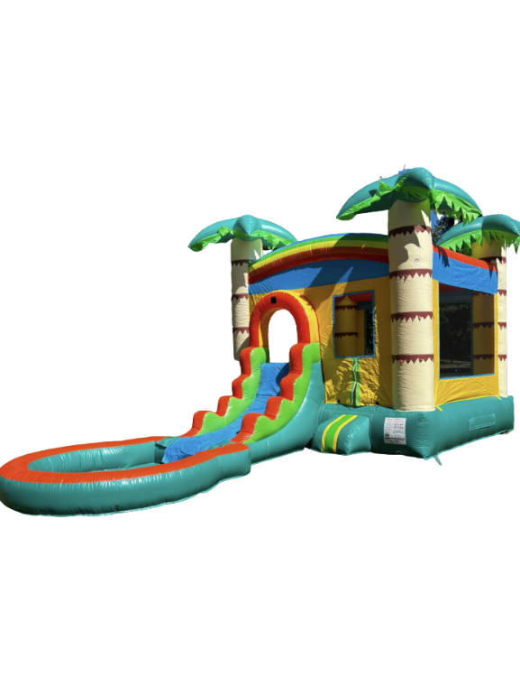 Our Tropical Palm Bounce House Combo ! This cool combo is a fun bouncer in the front and has a wild slide on the side! This bounce house is fun for ages four and up!! Hurry and book the Aloha Bounce House Combo to make your event the best one yet! Ages 4 & under!
