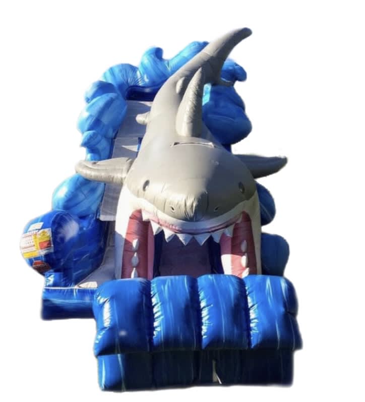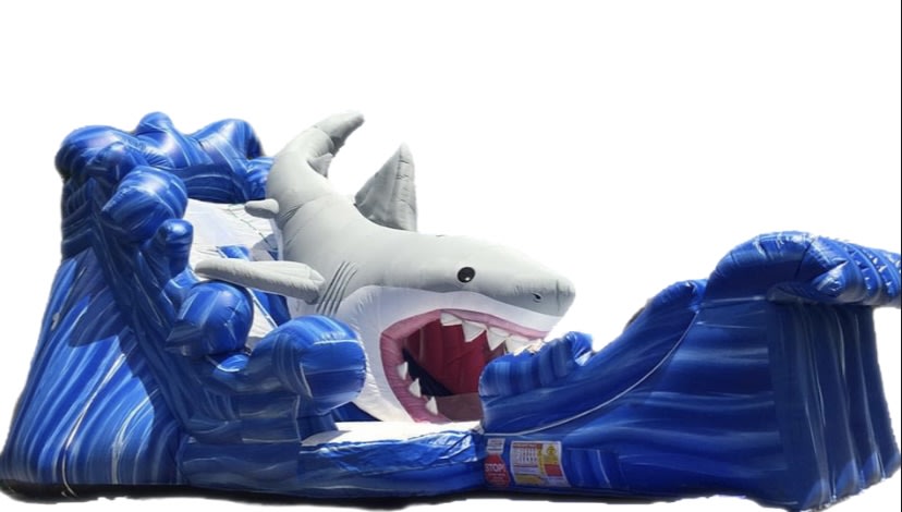 This giant waterslide is so much fun! Take the plunge from high in the air down into the pool below in our Gone Fishing Shark Waterslide!! This slide is awesome for ages 5 and up! Hurry and book this amazing unit before it is booked for another party! L 35'x W17'x H20'