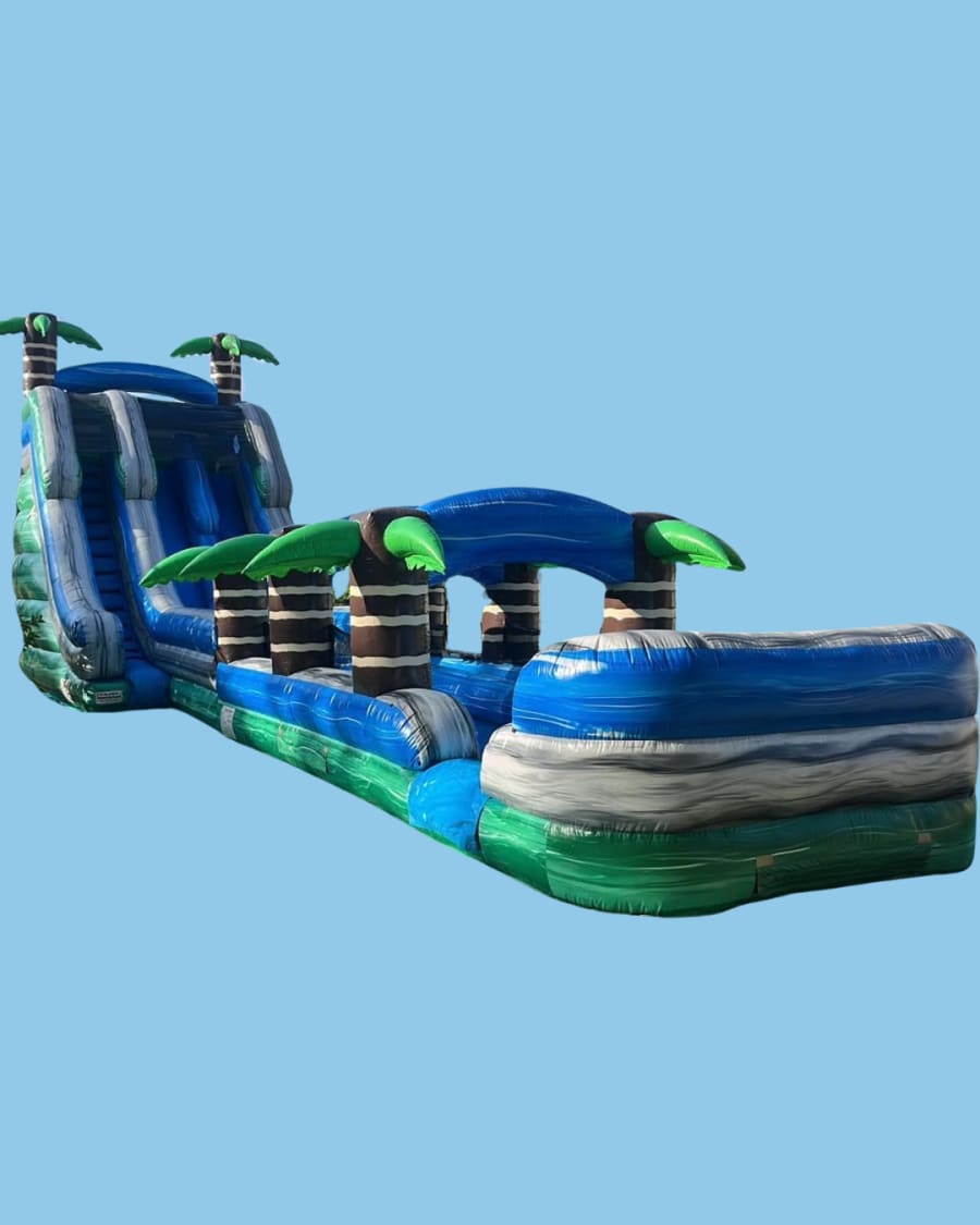 Bring tropical fun to your backyard bash with our 22' Dual Lane Tropical Waterslide Slip & Slide — towering 22 feet high and stretching a thrilling 60 feet long! 🌴💦 Perfect for birthday parties, family reunions, or any day the Florida sun says “let’s get wet,” this dual-lane slide lets two riders race side-by-side for double the squeals and double the ice-cream-stain-free smiles. 😄